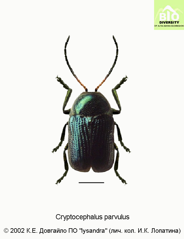 Представитель семейства жуков-листоедов (Coleoptera, Chrysomelidae). Длина тела 3,0 - 4,5 мм. Тело цилиндрическое, на концах тупо округленное. Сине-зеленый или темно-зеленый, без желтого рисунка. Точечные ряды на надкрыльях глубокие, продолжаются до вершины, переднеспинка с крупными частыми точками, с глубокими косыми вдавлениями (1). Яйцевые чехлики спирально-ячеистой скульптуры, не стебельчатые. Личинка очень сходна с личинками Сlytrinae, с толстым белым или желтоватым телом, задняя часть брюшка подогнута под переднюю, а срединные тергиты брюшка сильно расширенные. Ноги длинные с крупными коготками, голенелапка на верхней стороне с тонкими, на нижней - с толстыми шиповидными щетинками. Личиночный чехлик без скульптуры или она едва намечена в виде слабых продольных килей (2).