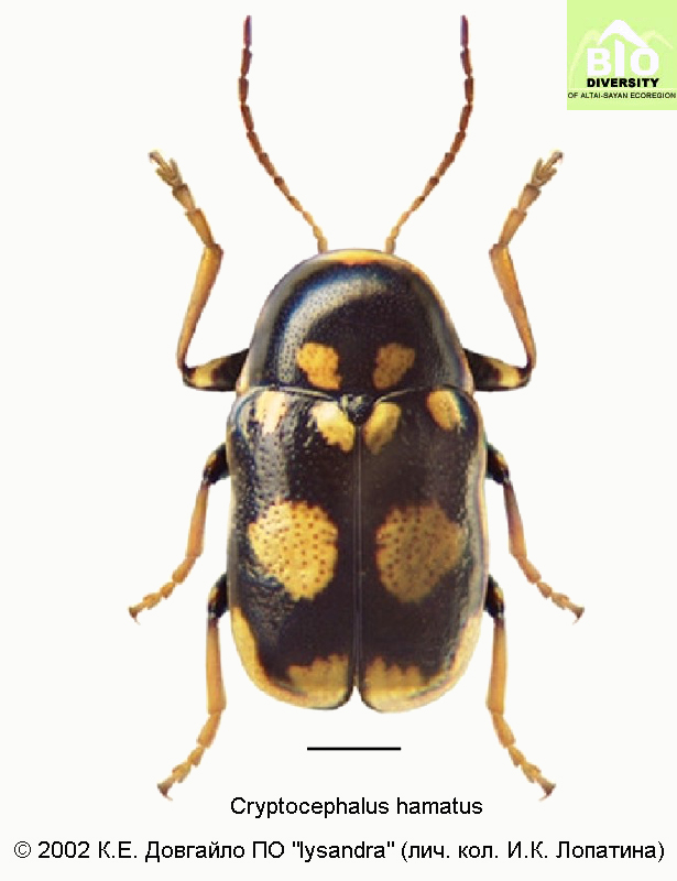 Представитель семейства жуков-листоедов (Coleoptera, Chrysomelidae). Длина тела: 4,5 - 5,5 мм. Тело цилиндрическое, на концах тупо округленное. Крупный, блестящий. верх черный, перднеспинка с желтыми передним и прерванным посередине боковым краем и 2 пятнами у основания. Надкрылья с 5 желтыми пятнами. Ноги желторыжие, бедра черные с желтым предвершинным пятном, лапки всегда светлые (1). Яйцевые чехлики спирально-ячеистой скульптуры, не стебельчатые. Личинка очень сходна с личинками Сlytrinae, с толстым белым или желтоватым телом, задняя часть брюшка подогнута под переднюю, а срединные тергиты брюшка сильно расширенные. Ноги длинные с крупными коготками, голенелапка на верхней стороне с тонкими, на нижней - с толстыми шиповидными щетинками. Личиночный чехлик без скульптуры или она едва намечена в виде слабых продольных килей (2).