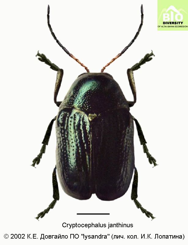 Представитель семейства жуков-листоедов (Coleoptera, Chrysomelidae). Длина тела 3,3 - 4,5 мм. Тело цилиндрическое, на концах тупо округленное. Темно-синий или сине-зеленый, лоб с желтыми пятнами, передний край переднеспинки у самца желтый. боковая каемка переднеспинки очень узкая, кзади не расширенная, переднеспинка густоточечная (1). Яйцевые чехлики спирально-ячеистой скульптуры, не стебельчатые. Личинка очень сходна с личинками Сlytrinae, с толстым белым или желтоватым телом, задняя часть брюшка подогнута под переднюю, а срединные тергиты брюшка сильно расширенные. Ноги длинные с крупными коготками, голенелапка на верхней стороне с тонкими, на нижней - с толстыми шиповидными щетинками. Личиночный чехлик без скульптуры или она едва намечена в виде слабых продольных килей (2).