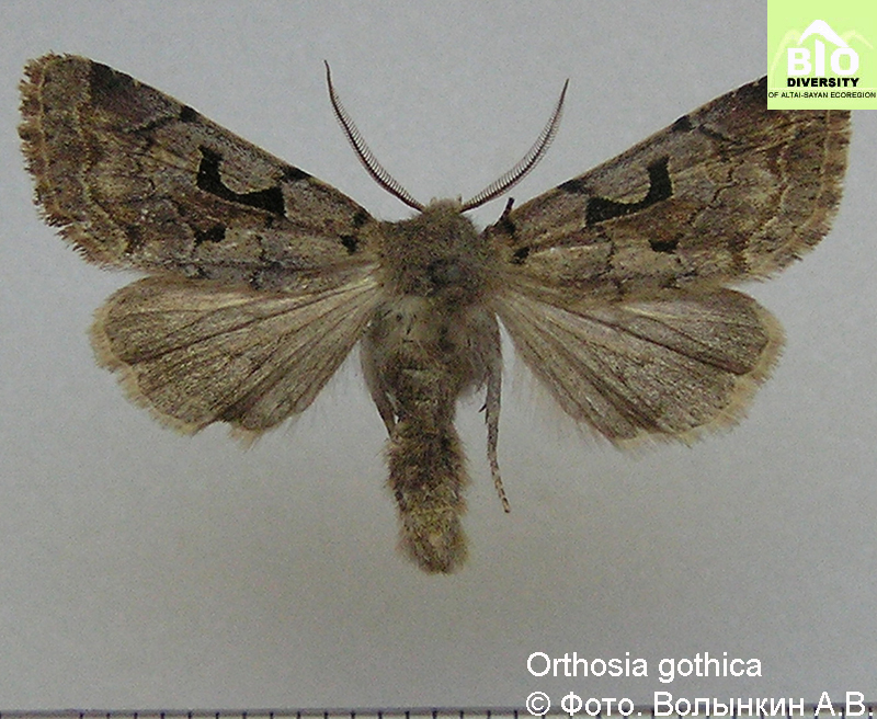 Глаза с волосками, усики самцов с гребенкой. голова и грудь коричневые. Размах крыльев 33–39 мм. Фон переднего крыла коричневый. Внутренняя и внешняя поперечные перевязи черно-бурые, волнистые, часто распадаются на длинные штрихи. Подкраевая линия ломаная, кнутри коричневая, кнаружи осветлена. Краевая линия из мелких черных точек. Круглое и почковидное пятна одного цвета с фоном, почти без окантовки, часто почти неразличимы. Круглое пятно открыто к костальному краю. В медиальной ячейке между внутренней поперечной перевязью и почковидным пятном крупное черно-бурое пятно, отдаленно напоминающее по форме букву "С". У корня 2 черно-бурых пятнышка неправильной формы. По одному черно-бурому пятнышку по костальному краю на внутренней и внешней поперечных перевязях. В срединном поле также часто имеется темное пятно неправильной формы, размер которого варьирует. В подкраевом поле у костального края крупное темно-коричневое пятно. Бахромка пятнистая. Заднее крыло светло-коричневое, у корня осветлено. Дискальное пятно темное, нечеткое. Бахромка светлее фона.