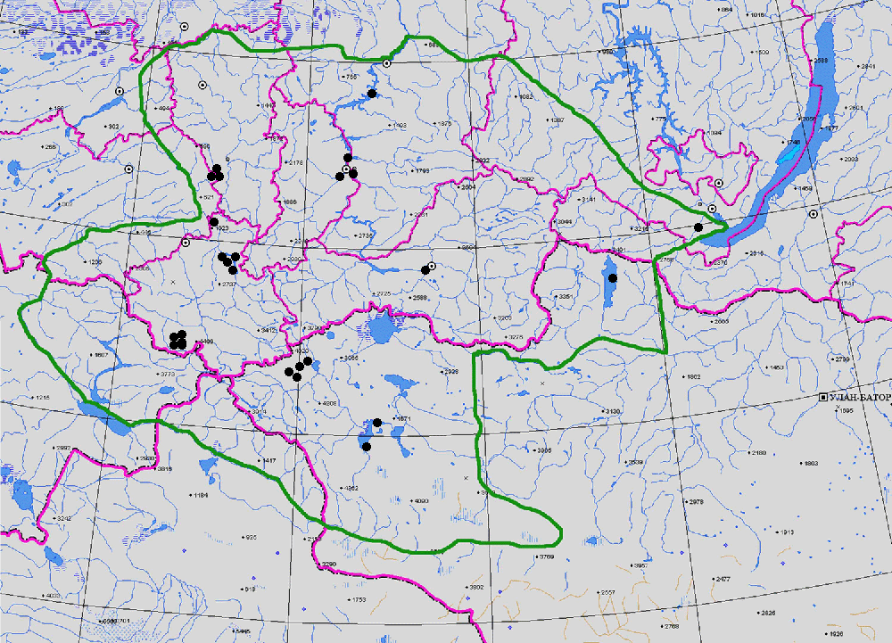 ГЕОГРАФ. АРЕАЛ: Республика Алтай – р. Бия, оз. Телецкое, Катунский хр. – оз. В., Ср., Н. Мультинское, оз. Тайменье, оз. Кочурлинское, оз Кольадын, оз. Бланду-Коль, оз. Сокорок-Коль, Кемеровская обл.– Карачумышское водохранилище, р.Кундустуюл, временные водоемы, Красноярский край – Енисей, Красноярское водохранилище, Республика Хакасия – Енисей, р. Абакан, Республика Тыва – Енисей, Иркутская обл. – р. Иркут, Монголия – оз. Хоргон, оз. Хотон, оз. Даян, оз. Хара, оз.Хара-Ус, оз. Ногон, оз. Хубсугул.