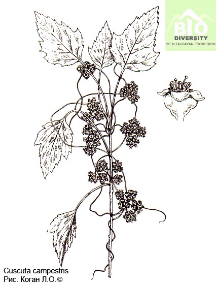 ДОП. ИНФОРМАЦИЯ Заносное растение. Родина – Сев. Амер. (2). Паразитирует на разнотравье: крапиве двудомной, горцах, полынях, маревых и мн. др., на сорняках и культурных растениях (клевер, люцерна, вика, овес, ячмень, тимофеевка и др.). Цветёт в июле-августе, плодоносит в августе-сентябре (зависит от региона). Впервые о нахождении этого вида в пределах России сообщает Д. Ларионов в 1913 г. (2). Стебли повилики полевой на скошенном растении-хозяине сохраняют жизнеспособность более месяца. При благоприятных почвенных и температурных условиях всходы повилики появляются через 20–25 дней с глубины до 5 см. В течение 2-х недель проростки питаются за счет запасов в семени, затем присасываются к культурным или сорным растениям на высоте 7–12 см от поверхности почвы. На одном растении может образоваться 15–20 тыс. семян. Жизнеспособность семян 6–7 лет. Содержит кумарины, флавоноиды, углеводы (8). Тепло- и светолюбивое растение. Является карантинным сорным растением, имеющим ограниченное распространение на территории России (3).