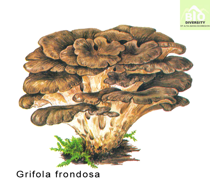 SYNONYMUM Boletus cristatus Gouan 1762, Hortus monsp.: 462; Boletus frondosus Schrank 1789, Baier. Fl. 2: 616; Boletus frondosus Dicks. 1785, Fasc. pl. crypt. brit. (London) 1: 18; Boletus intybaceus Baumg. 1790, Fl. Lips. 2: 631; Caloporus frondosus (Dicks.) Quel. 1888, Fl. mycol. (Paris): 406; Cladodendron frondosus (Dicks.) Lazaro Ibiza 1916, Revta R. Acad. Cienc. exact. fis. nat. Madr. 14: 864; Cladomeris frondosa (Dicks.) Quel. 1886, Enchir. fung. (Paris): 168; Fungus squamatin-incumbens Paulet 1793, Traite Champ., Atlas 2: 121; Grifola albicans Imazeki 1943, J. Jap. Bot. 19: 386; Grifola frondosa f. intybacea (Fr.) Pilat 1936, Atl. Champ. Europ. 3: 35; Grifola frondosa var. intybacea (Fr.) Cetto 1987, Enzyklopadie der Pilze, Band 1: Leistlinge, Korallen, Porlinge, Rohrlinge, Kremplinge u.a. (Munchen): 317; Grifola intybacea (Fr.) Imazeki 1943, Bull. Tokyo Sci. Mus. 6: 98; Merisma frondosum (Dicks.) Gillet 1878, Hymenomycetes (Alencon): 692; Merisma intybaceum (Fr.) Gillet 1878, Hymenomycetes (Alencon): 692; Polypilus frondosus (Dicks.) P. Karst. 1882, Bidr. Kann. Finl. Nat. Folk 37: 25; Polypilus intybaceus (Fr.) P. Karst. 1882, Bidr. Kann. Finl. Nat. Folk 37: 25; Polyporus albicans (Imazeki) Teng 1963, Chung-kuo Ti Chen-chun: 762; Polyporus barrelieri Viv. 1834, Fungi italica: 28; Polyporus frondosus (Dicks.) Fr. 1821, Syst. mycol. (Lundae) 1: 355; Polyporus intybaceus Fr. 1838, Epicr. syst. mycol. (Upsaliae): 446.
