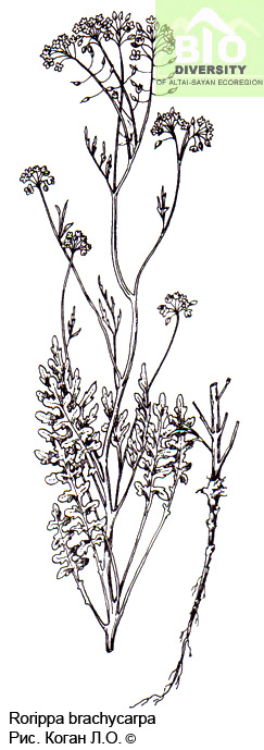 Rorippa brachycarpa (C.A. Mey.) Hayek, 1925, Feddes Repert. 30 : 390. – Жерушник короткоплодный.