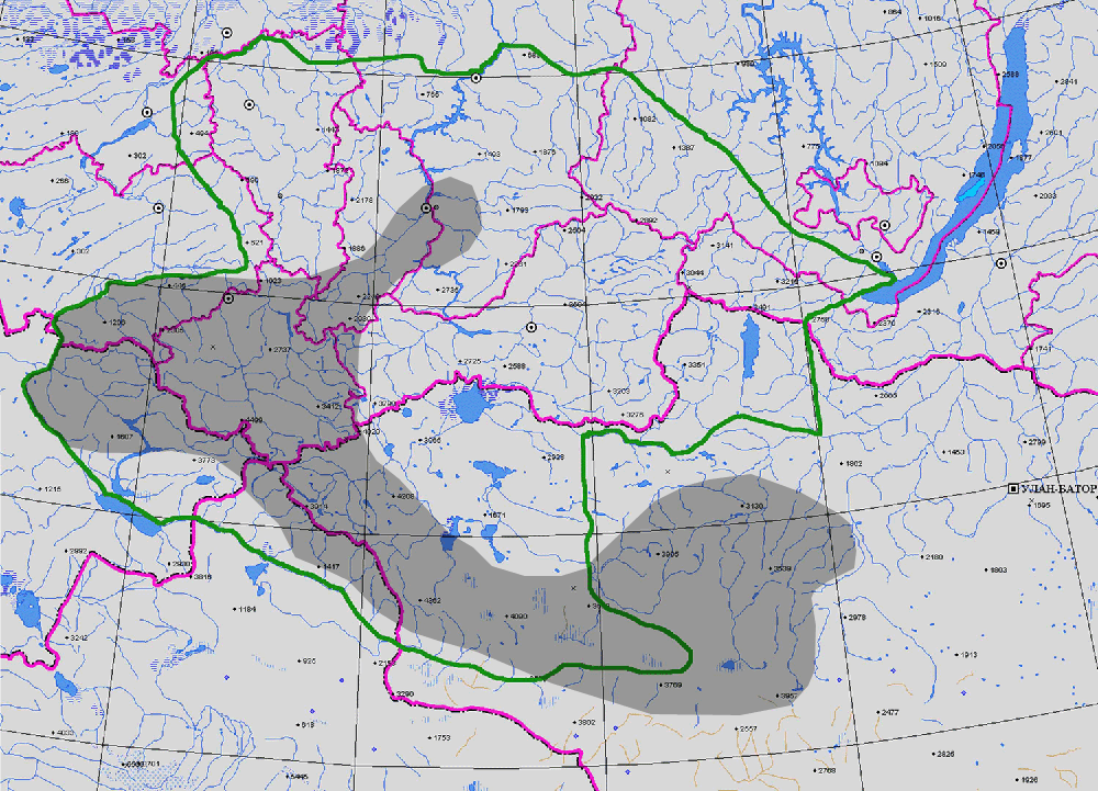 ГЕОГРАФ. АРЕАЛ: Хр. Колыванский, хр. Тигирекский, хр. Ульбинский, хр. Теректинский, котловина Минусинская, Кузнецкий Алатау (1, 2).