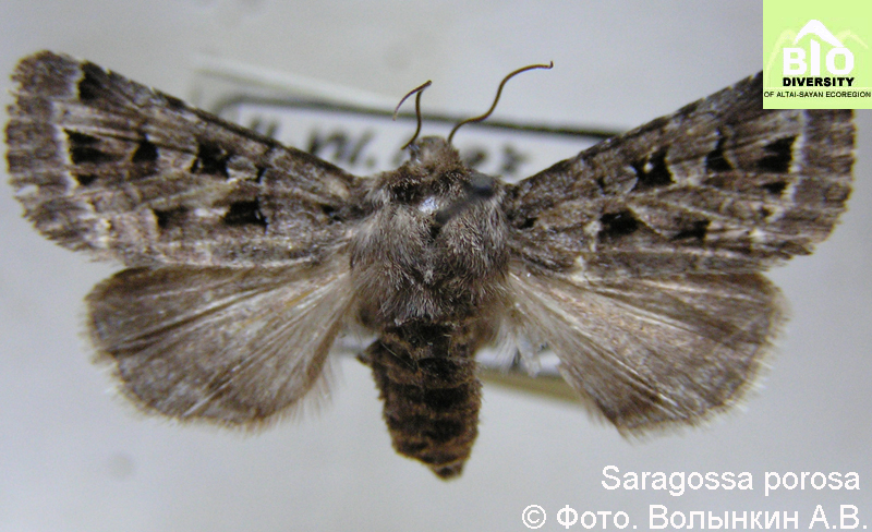 Глаза с волосками, усики самцов гребенчатые, самок – реснитчатые. Голова и грудь серые. Размах крыльев 29–33. Фон переднего крыла коричневато-серый. Поперечные перевязи волнистые, светлые. Подкраевая линия беловатая, почти прямая, в подкраевом поле несет несколько черных клиновидных штрихов разного размера. Клиновидное пятно черное, широкое. Круглое и почковидное пятна одного цвета с фоном, сливаются с ним. Медиальная ячейка между пятнами и кнаружи от почковидного заполнена черным. В срединном поле у внешней перевязи напротив клиновидного пятна черное пятно неправильной формы. В подкраевом поле у костального края черноватое пятно. Бахромка одного цвета с фоном. Заднее крыло коричнево-серое, со следами широкой перевязи. Бахромка одного цвета с фоном.